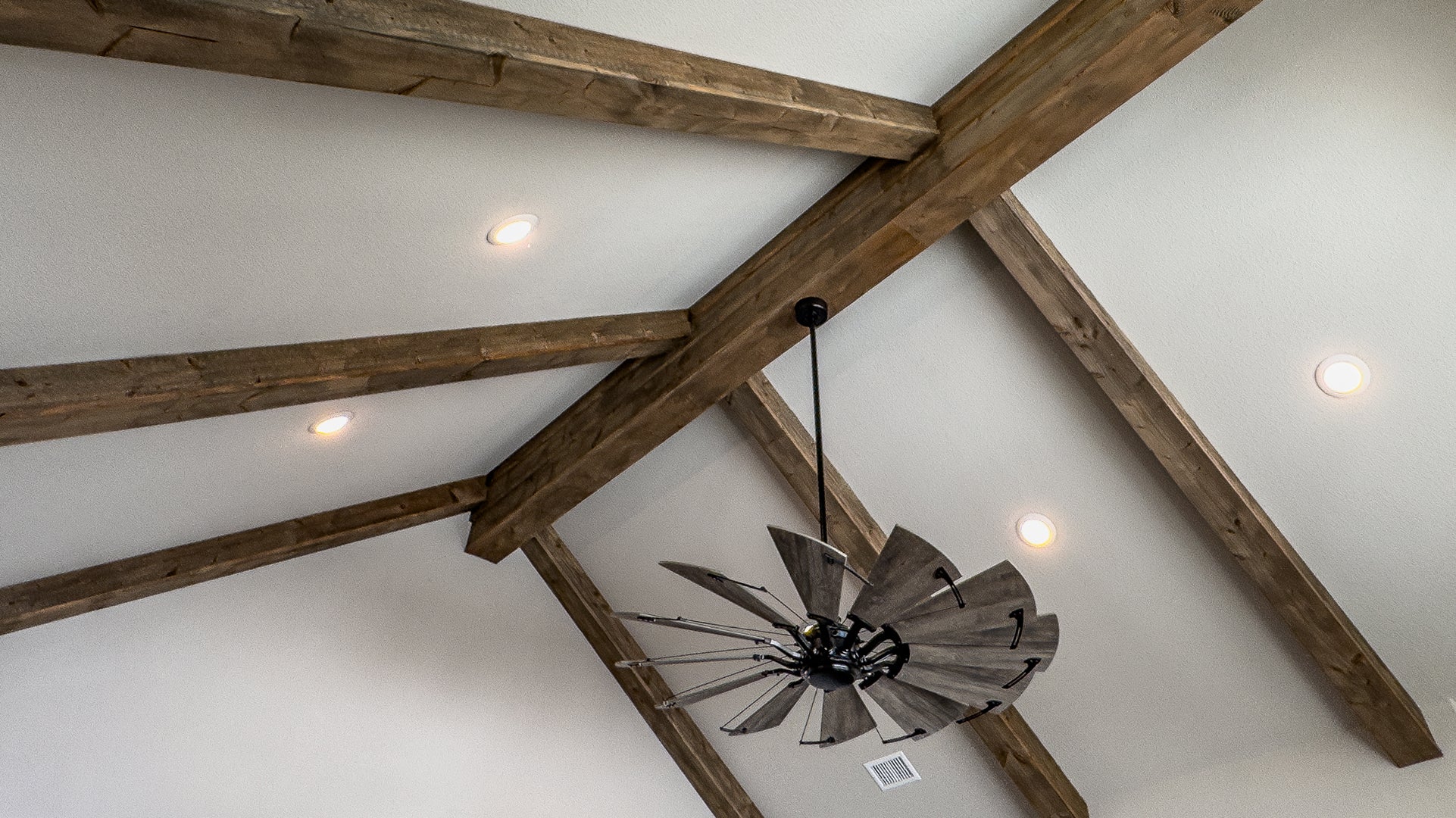The windmill-style ceiling fan is another standout feature, blending perfectly with the home's rustic aesthetic while providing comfort and style. The dark wood-look luxury vinyl plank flooring throughout the main living areas adds warmth and durability, grounding the light and airy space.