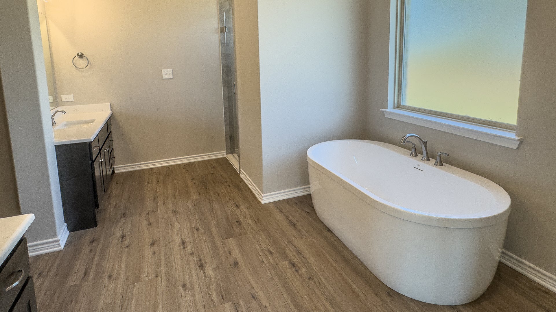 A central hallway between the vanities leads to a tall, built-in linen cabinet and his and hers walk-in closets, offering exceptional storage. The wood-look flooring extends into the bathroom, creating a warm and inviting atmosphere. The design also incorporates a spacious walk-in shower with modern tilework and a beautiful freestanding tub sits beneath a large window, offering a perfect spot to unwind and enjoy the peace of your surroundings.
