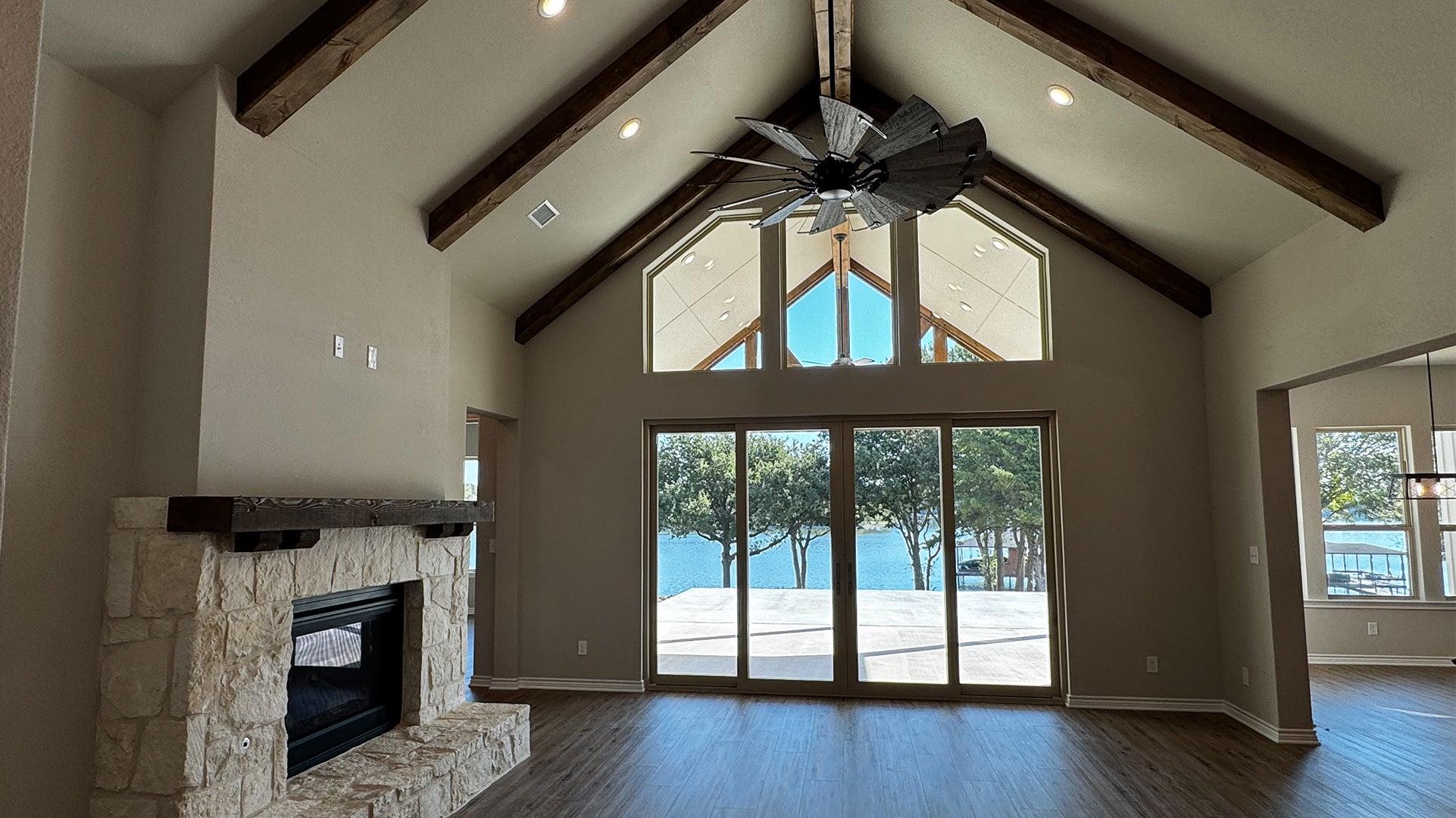 The rear of the home, facing the water, is dominated by a wall of sliding glass doors that invite breathtaking views and fill the interior with natural light. Above the multi-panel doors, large geometric windows follow the dramatic pitch of the vaulted ceiling, which is accented with heavy dark-wood beams. This combination of design elements creates a bright, airy living space with rustic grandeur and panoramic views of the tranquil water beyond.