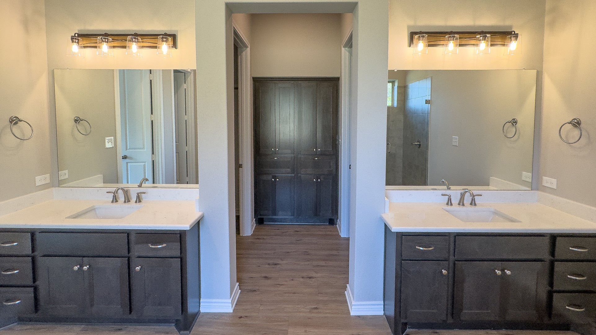 The master suite continues the home's theme of comfortable luxury. The master bathroom is a private retreat designed with symmetry and sophistication. It features dual vanities with dark wood cabinetry and clean white countertops, providing ample personal space. Each vanity is complete with its own large mirror and stylish lighting fixture.