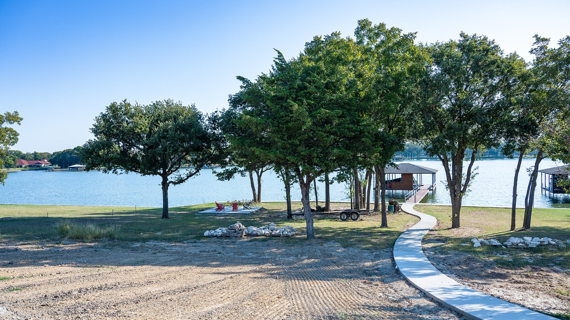 This Texas ranch-style home showcases a perfect blend of charm and sophistication, with a design that feels both timeless and inviting. The exterior makes an impression with its mix of rugged stone with herringbone brick detailing in the gables, and rich dark-stained wood accents that add depth and character. Set against the backdrop of a scenic waterfront, this home exudes a sense of grandeur while maintaining a welcoming ranch aesthetic.